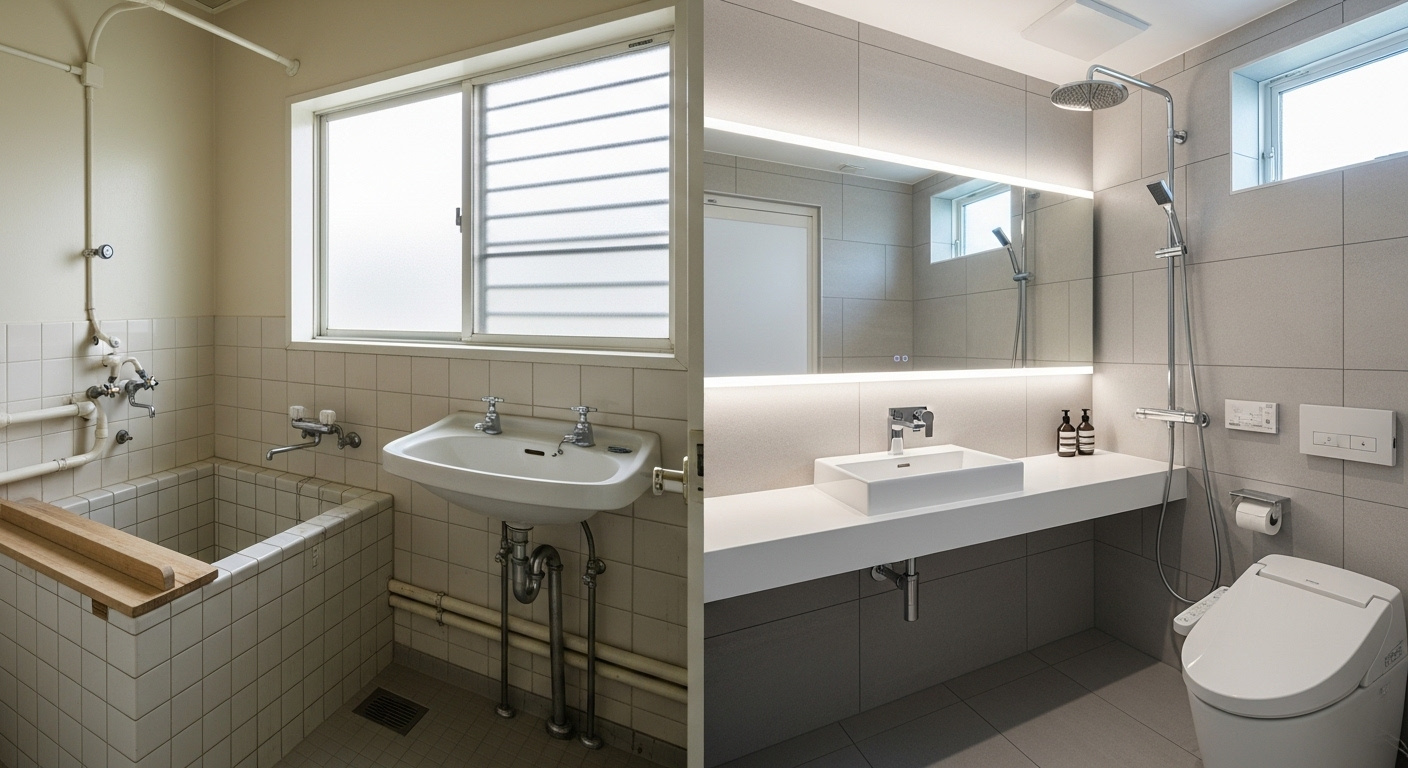 一方、築20年以上ではガスコンロ仕様のままのものや、3点ユニットバス(トイレ・洗面・浴室が一体)になっているケースもまだ残っています。